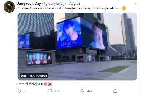 Gedung-gedung di SMTOWN dipenuhi wajah Jungkook dan ucapan ulang tahun untuknya. Bahkan, di bagian pilar bangunan SMTOWN COEX Atrium terpampang nyata wajah Jungkook BTS.