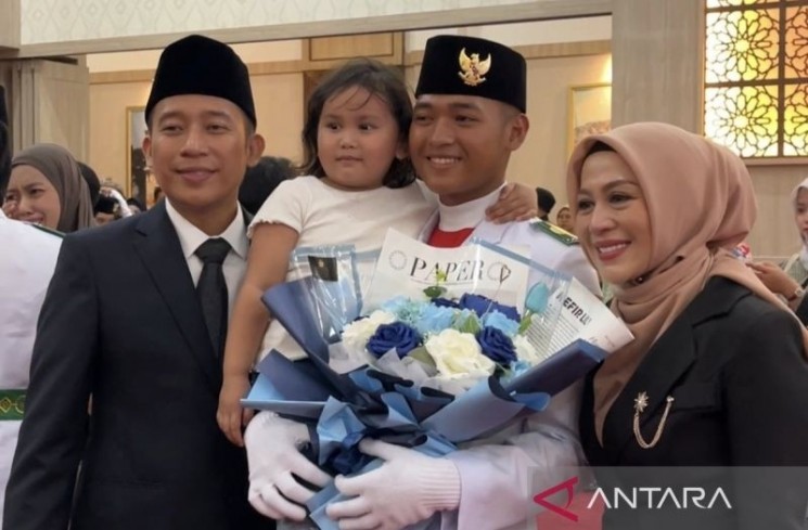 Anggota DPR RI Komisi X sekaligus komedian Denny Cagur (kiri) dan istri bersama putranya Fabian Muhammad Yahva dikukuhkan sebagai anggota Pasukan Pengibar Bendera Pusaka (Paskibraka) Provinsi Banten di Aula Pendopo Gubernur Banten, Kota Serang, Banten, Kamis (14/7/2025). ANTARA/Devi Nindy.