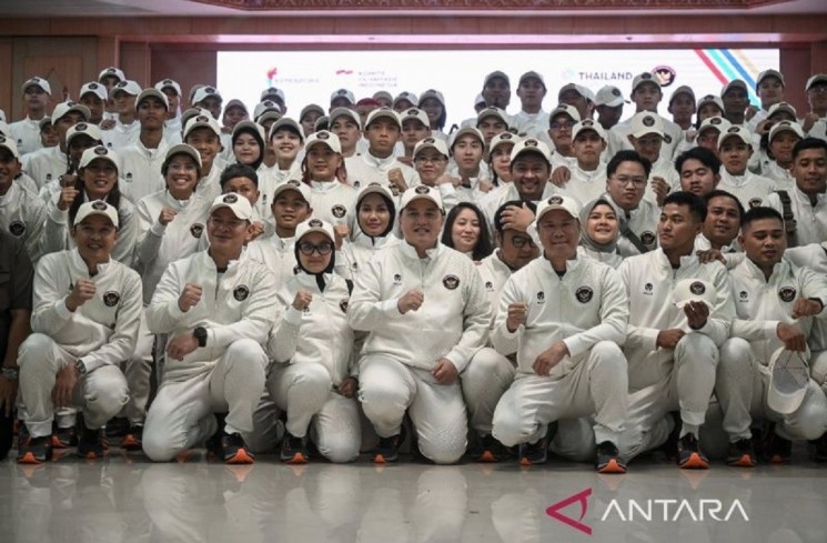Menteri Pemuda dan Olahraga Erick Thohir (tengah bawah), Wamenpora Taufik Hidayat (kiri bawah), Ketua Umum Komite Olimpiade Indonesia (NOC Indonesia) Raja Sapta Oktohari (kedua kiri, bawah), CdM Kontingen Indonesia untuk SEA Games 2025 Bayu Priawan Djokosoetono (ketiga kanan, bawah) berfoto bersama atlet usai upacara pengukuhan tim Indonesia untuk SEA Games 2025 di kantor Kemenpora, Jakarta, Jumat (5/12/2025). Tim Indonesia menurunkan 1.021 atlet yang akan bertanding di 49 dari 51 cabang olahraga yang dipertandingkan dalam SEA Games 2025 di Thaliand pada 9-20 Desember 2025. ANTARA FOTO/Fauzan/tom.