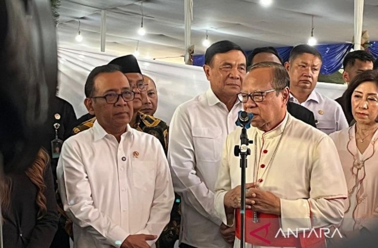 Menko PMK Pratikno (kiri) dan Uskup Agung Jakarta Kardinal Ignatius Suharyo Hardjoatmodjo (kanan) memberikan keterangan pers saat meninjau pelaksanaan Misa Malam Natal di Gereja Katedral, Jakarta, Rabu (24/12/2025). ANTARA/Asep Firmansyah