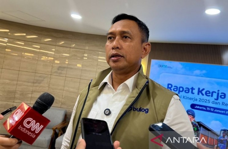 Direktur Utama Perum Bulog Ahmad Rizal Ramdhani menjawab pertanyaan awak media usai di sela memimpin Rapat Kerja Nasional bersama seluruh jajaran bertajuk Evaluasi Kinerja 2025 dan Rencana Kerja 2026 di Jakarta, Minggu (11/1/2026). ANTARA/Harianto