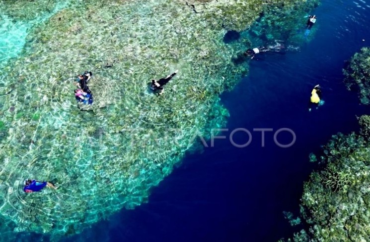 Ilustrasi - Foto udara wisatawan berenang dan snorkeling di Taman Laut Olele, Kabupaten Bone Bolango, Gorontalo, Kamis (1/1/2026). ANTARA FOTO/Adiwinata Solihin/bar