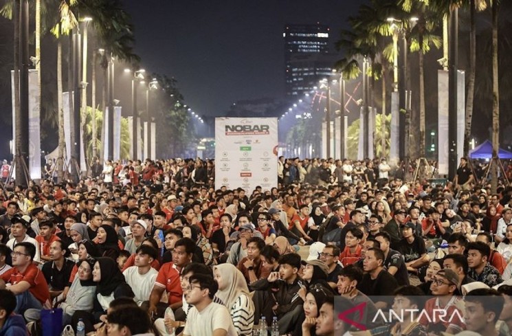Ilustrasi - Warga menyaksikan pertandingan Timnas Indonesia melawan Jepang pada laga lanjutan Grup C putaran ketiga Kualifikasi Piala Dunia 2026 Zona Asia saat kegiatan Nonton Bareng (Nobar) di kawasan Gelora Bung Karno, Senayan, Jakarta, Selasa (10/6/2025). ANTARA FOTO/Dhemas Reviyanto/tom.