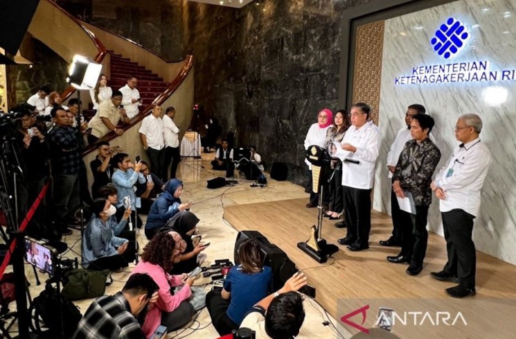 Menteri Ketenagakerjaan (Menaker) Yassierli didampingi jajarannya dalam jumpa pers di Jakarta, Rabu (1/4/2026). ANTARA/Harianto