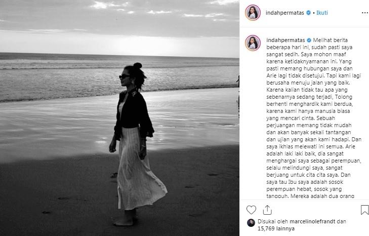 "Melihat berita beberapa hari ini, sudah pasti saya sangat sedih. Saya mohon maaf karena ketidaknyamanan ini. Yang pasti memang hubungan saya dan Arie lagi tidak disetujui," tulis Indah Permatasari dalam unggahannya di Instagram.